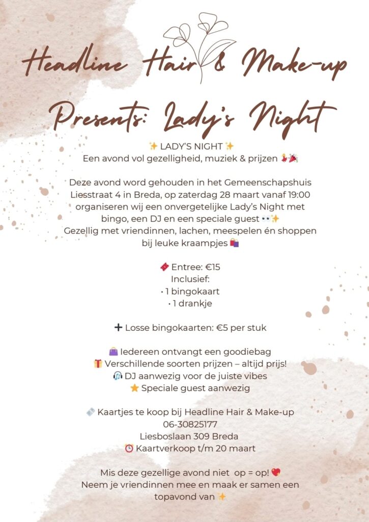 Op zaterdag 28 maart vanaf 19.00 uur is het tijd voor een gezellige en feestelijke Ladies Night, georganiseerd door Headline Hair & Make-up in ons gemeenschapshuis aan de Liesstraat 4 in Breda.